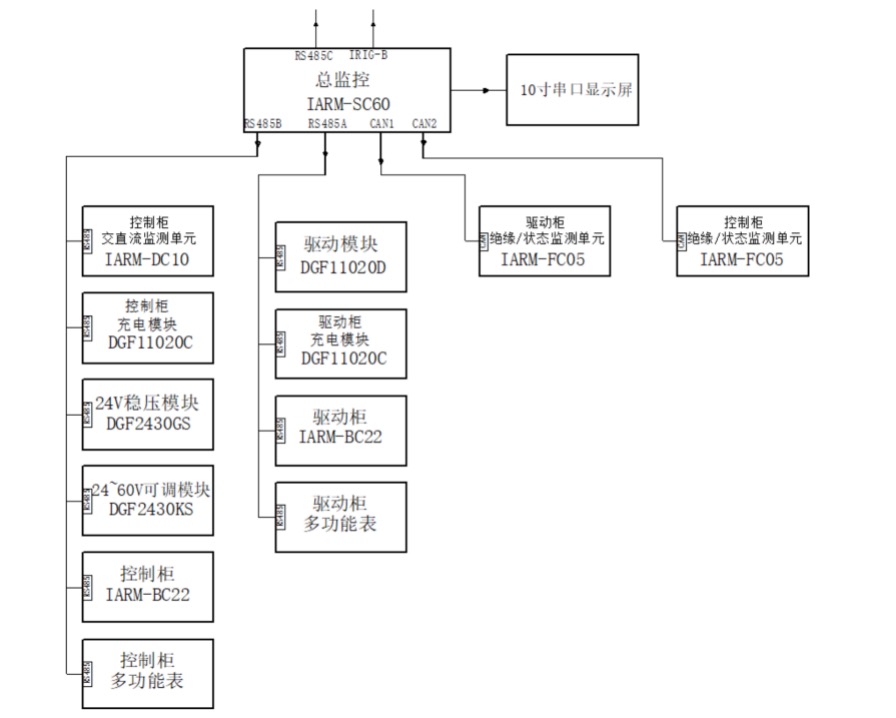 監(jiān)控部分采用集散方式對系統(tǒng)進(jìn)行監(jiān)測和控制,驅(qū)動(dòng)柜和控制柜的饋電的運(yùn)行狀態(tài)、電源模塊運(yùn)行參數(shù),分別由兩臺(tái)智能監(jiān)控系統(tǒng)采集處理,由監(jiān)控模塊統(tǒng)一處理后顯示在觸摸屏上,同時(shí)可通過人機(jī)交互操作方式對系統(tǒng)進(jìn)行設(shè)置和控制,還可接入遠(yuǎn)程監(jiān)控。監(jiān)控模塊還能對每個(gè)充電模塊進(jìn)行均/浮充控制、限流