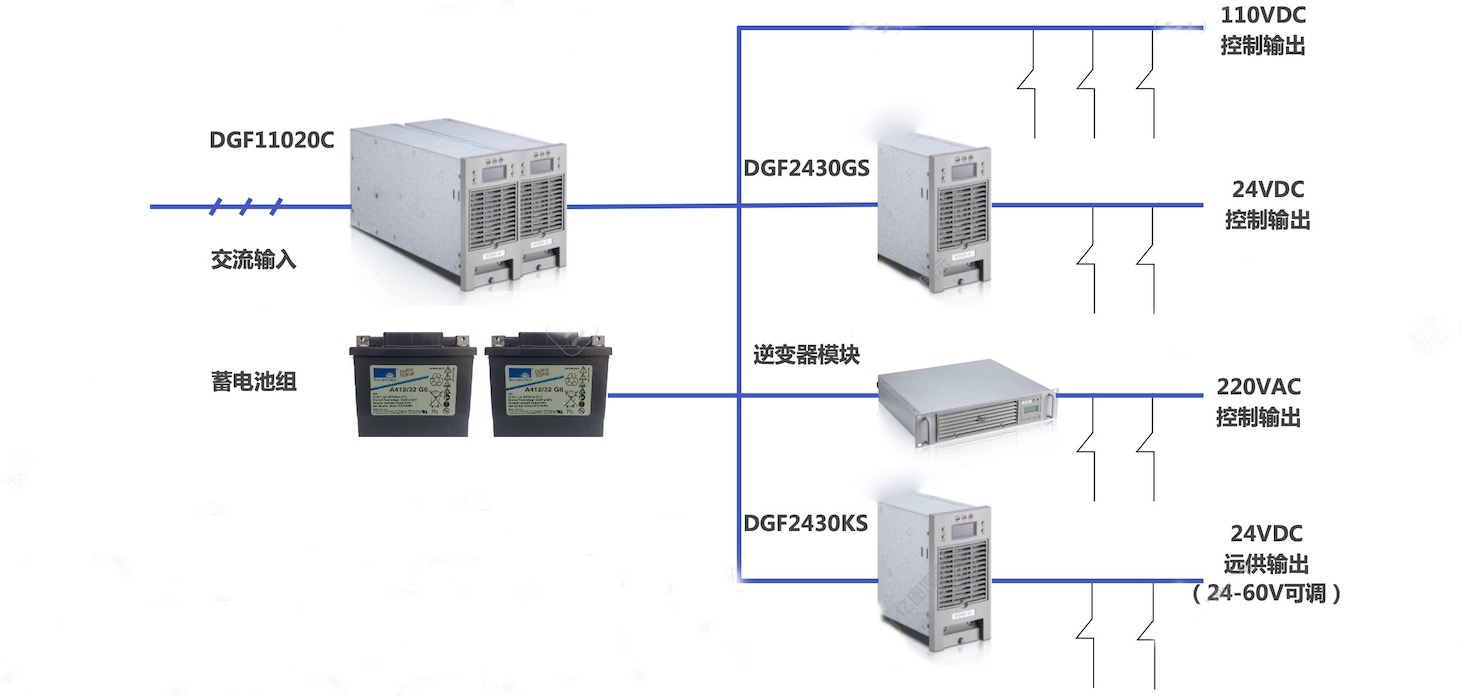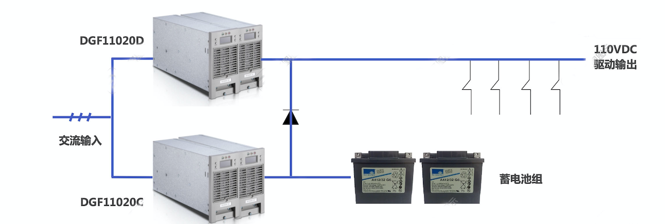 交流輸入正常時(shí),交流電源經(jīng)充電模塊輸出DC110V母線、母線上接UPS、24VDC降壓模塊24~56VDC可調(diào)模塊,同時(shí)給DC110V負(fù)載供電,充電模塊同時(shí)對蓄電池組進(jìn)行充電。一旦交流輸入中斷時(shí),充電模塊停止工作,蓄電池組直接向110VDC母線提供電力負(fù)荷,從而保證110VDC母線不間斷供電。